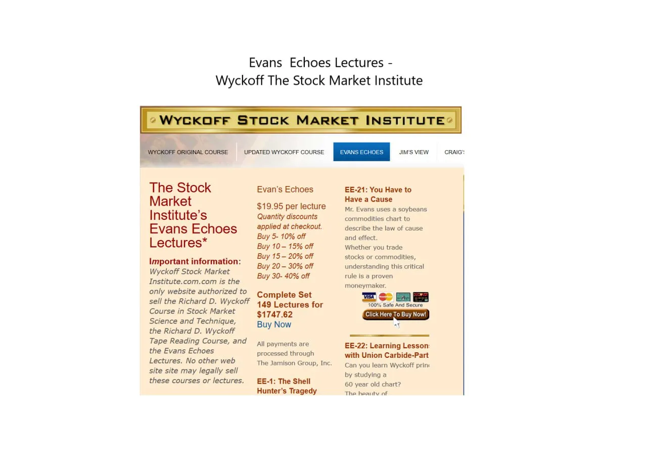 Welcome to the SMI Evans Echoes Lectures. Over the years, the Stock Market Institute has focused its efforts on teaching the Wyckoff Method to over 5 generations of students. While many stock issues have appeared and disappeared (Mr. Wyckoff probably would have been shocked to learn that a stock could be named Google). the Wyckoff methods and principles have remained constant and made many Wyckoff traders very successful.